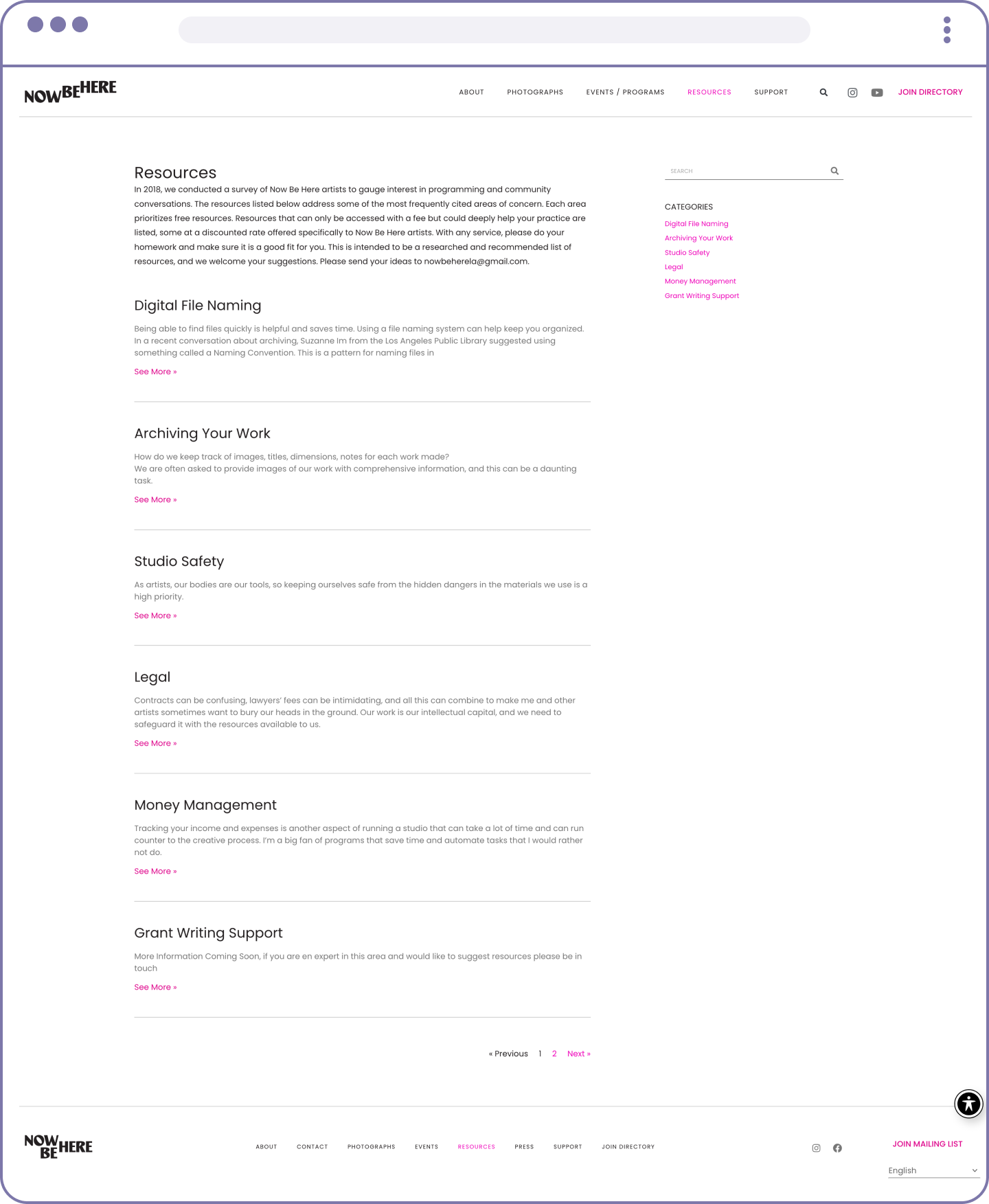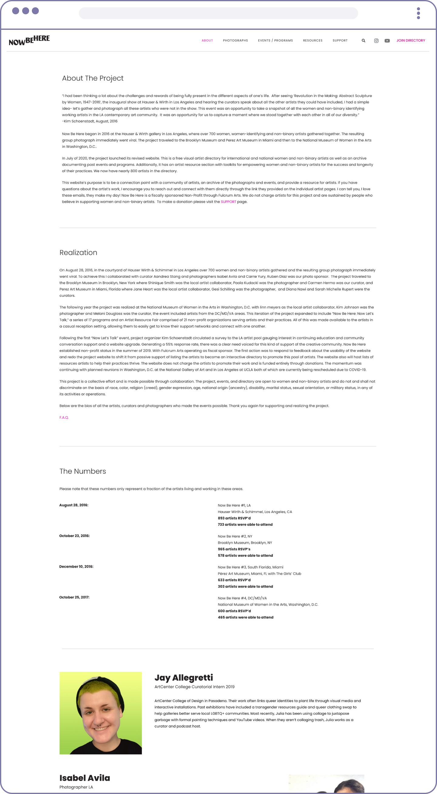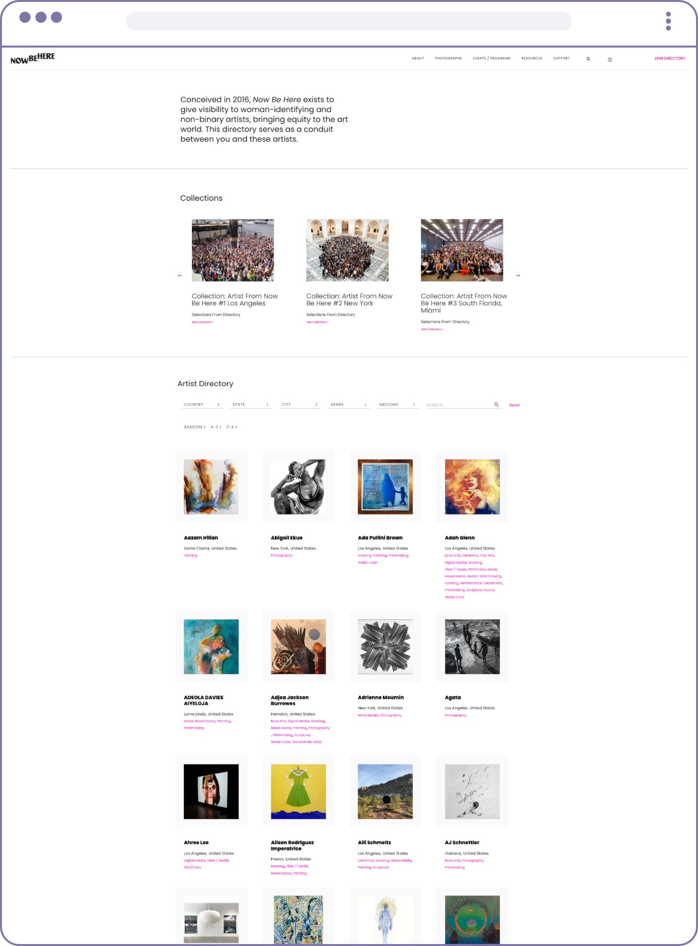 Now Be Here Los Angeles is an non-profit organization that exists to give visibility to women and non-binary artists, brining equity to the art world. This project was a full re-design of their website which initially was a blog with artists resources. The new vision for the website was to convert it into an artist directory for Women and Non-Binary artists locally and globally. This project was assigned to me during my internship at Wong.Digital.