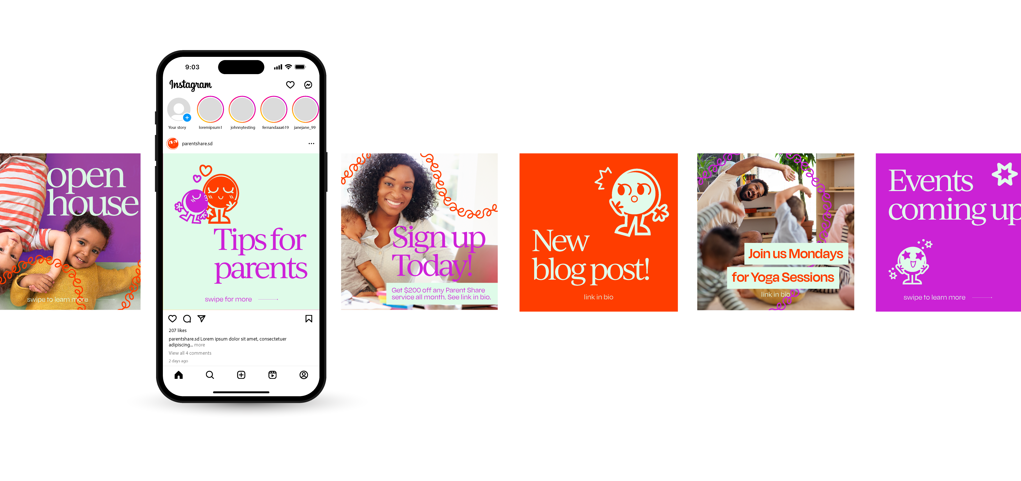 Other considerations taken were the use of photography representing diverse children and families, the creation of a mascot character, incorporating primary colors to the brand, and execution of an identity that differentiates Parent Share from existing co-working spaces.